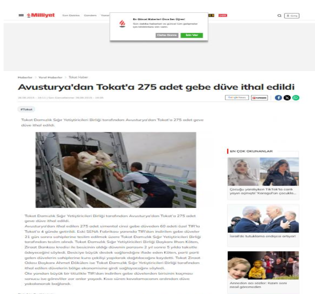 Avusturya’dan ithal edilen 275 adet simental cinsi gebe düveden 60 adeti özel TIR’la Tokat’a 4 günde getirildi. Eski SENA Fabrikası yanında TIR’dan indirilen gebe düveler 21 gün sonra sahiplerine teslim edilmek üzere Tokat Damızlık Sığır Yetiştiricileri Birliği tarafından teslim alındı. Tokat Damızlık Sığır Yetiştiricileri Birliği Başkanı İlhan Köten, Ziraat Bankası kredisi ile besicinin aldığı düvenin parasını 2 yıl sonra 5 yılda taksitle ödeyeceğini söyledi. Besiciye büyük destek sağlandığını ifade eden Köten, parti parti gelen düvelerin sahiplerine kura çekilişi yapılarak dağıtılacağını kaydetti. Tokat Ziraat Odası Başkanı Ahmet Dökülen ise Tokat Damızlık Sığır Yetiştiricileri Birliği tarafından ithal edilen düvelerin bölge ekonomisine girdi sağlayacağını söyledi.